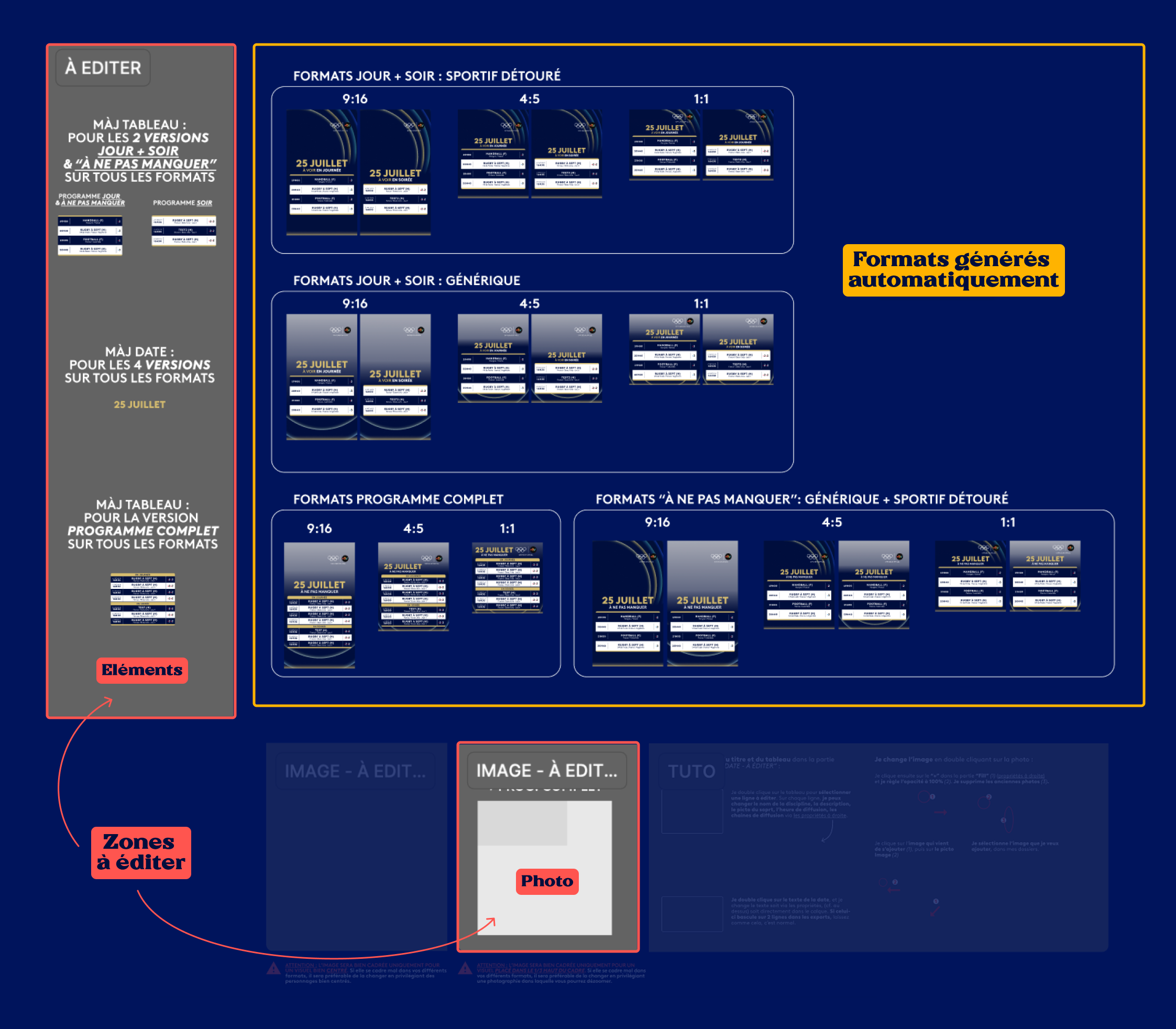 Les gabarits ont été pensés pour offrir à la fois souplesse d’usage et uniformité visuelle, avec des déclinaisons automatiques selon les formats, les sports ou les plateformes (Instagram, X, Facebook, etc.).