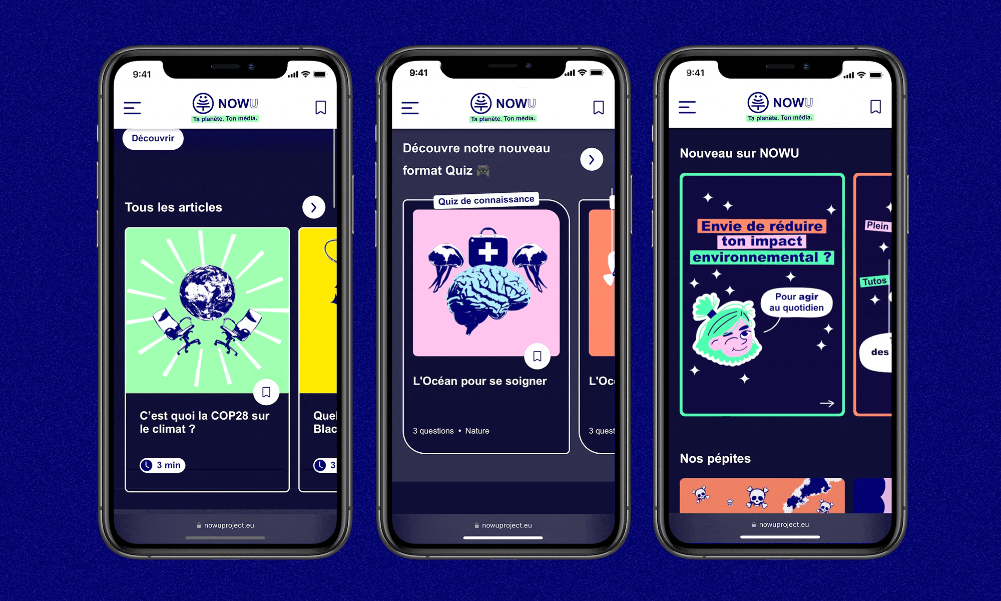 NOWU est un média numérique lancé par France Télévisions et dédié à la sensibilisation des jeunes générations aux enjeux environnementaux. Sa particularité : informer sans moraliser, en privilégiant une approche positive, accessible et orientée vers l’action. Chaque jour, le média proposait un article et une solution concrète, publiés sur un site éco-conçu, accompagnés de contenus sociaux engageants mêlant humour, pop culture et pédagogie.